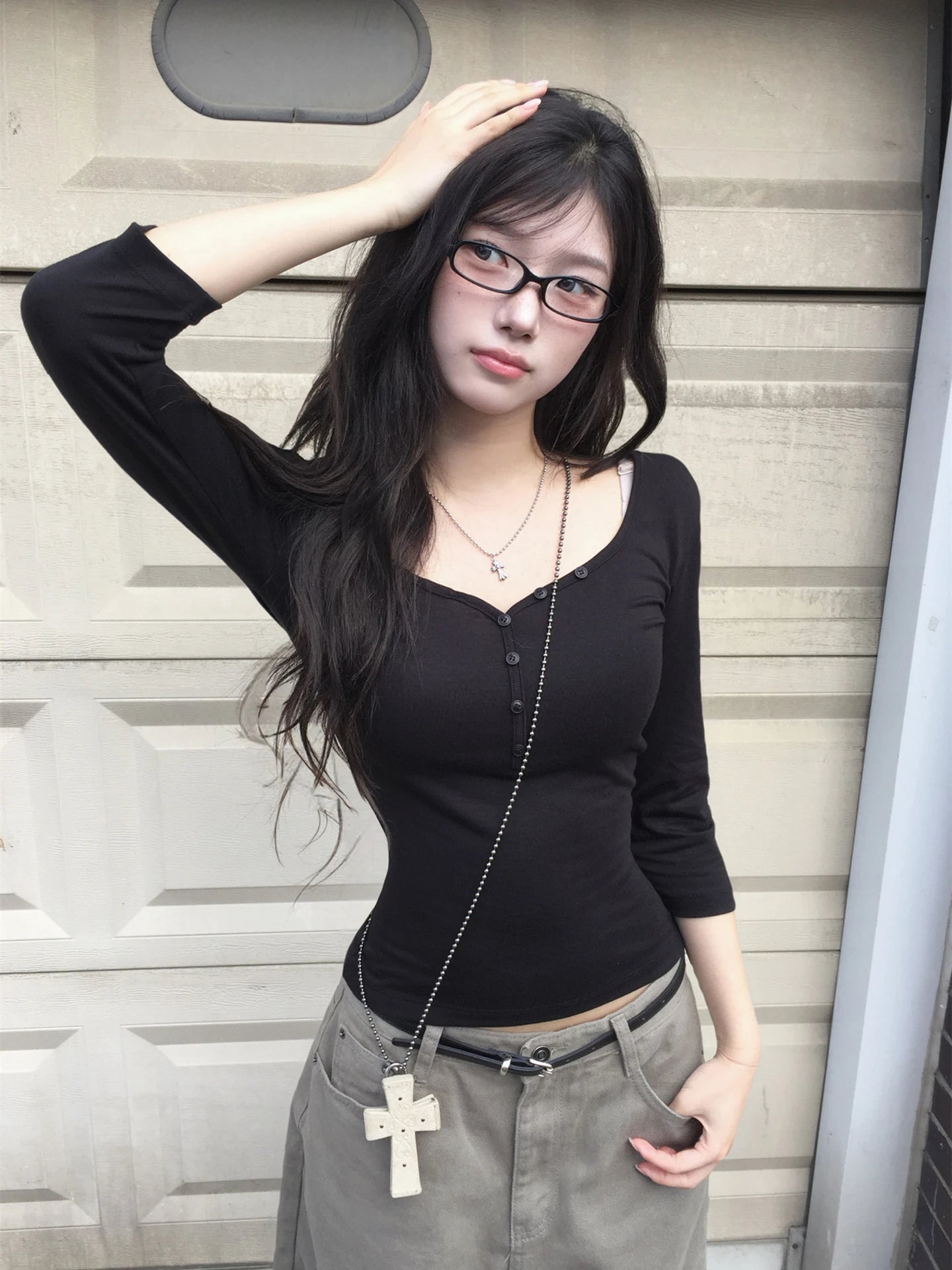 Hugcitar Fashion Pure Color O Neck Three Quarter Sleeve Buttons Women'S Blouse Shirt Women Casual Tops Streetwear Festival